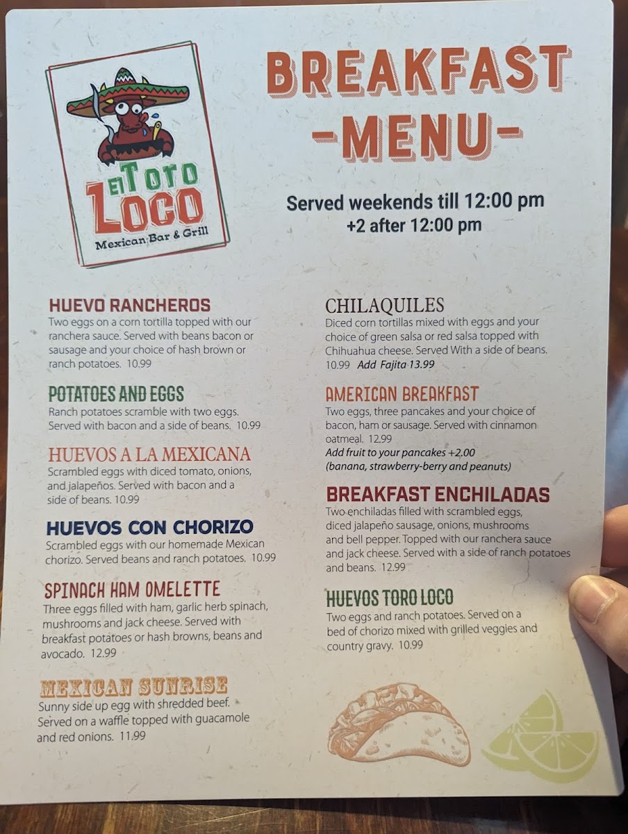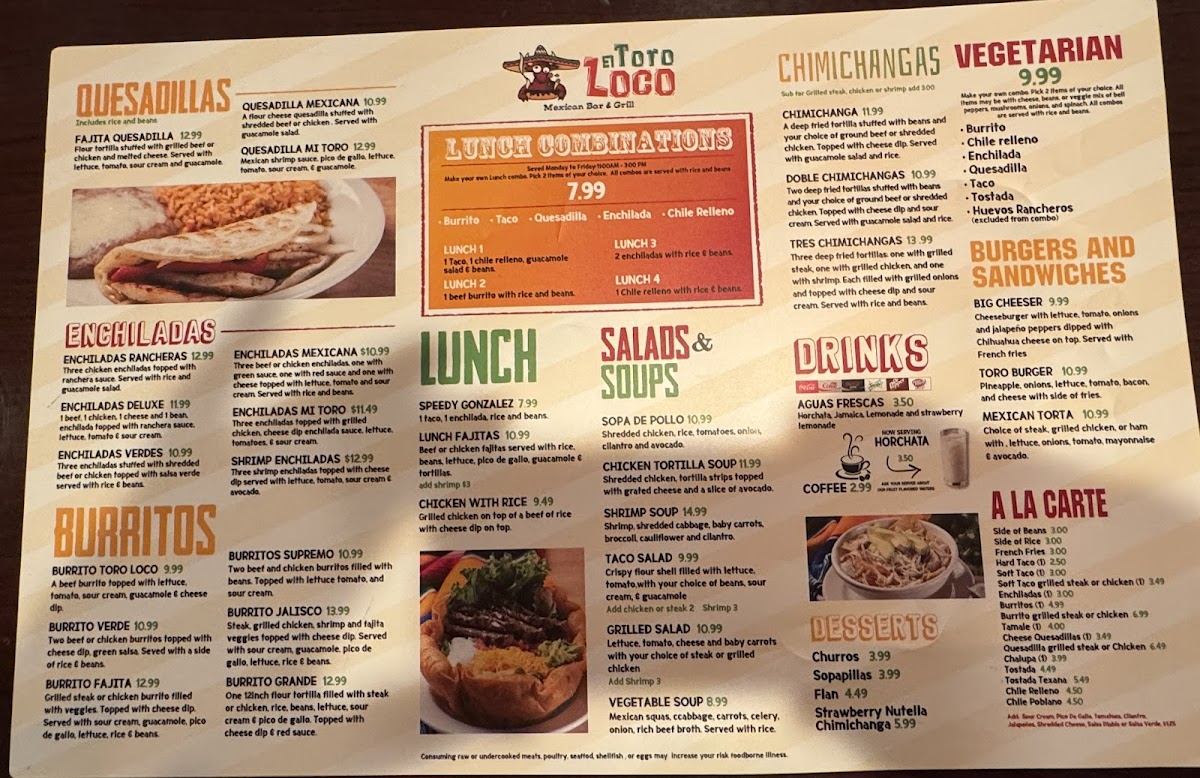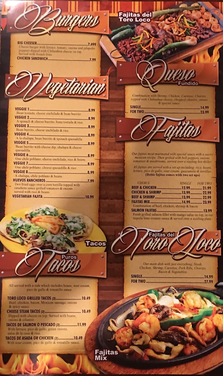 El Toro Loco's menu is a delightful fusion of traditional Mexican flavors with generous portions that satisfy every appetite. Their lunch menu, available daily from 11:00 AM to 3:00 PM, features crowd-pleasers like the Chile Relleno and Beef or Chicken Quesadilla, all served with flavorful rice and beans, making it an accessible option for a quick yet satisfying meal.